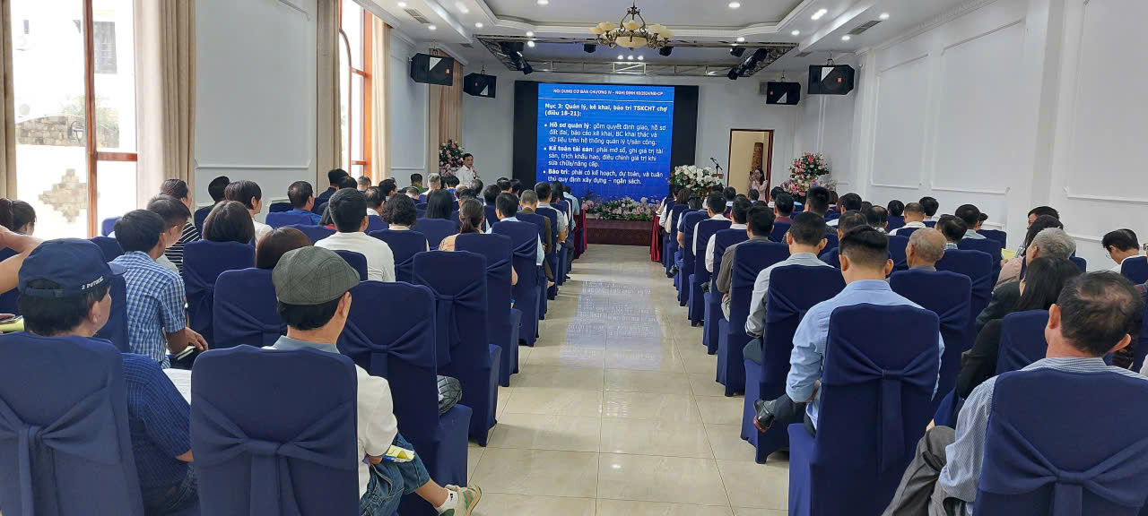 Nghị định số 60/2024/NĐ-CP ngày 5/6/2024 của Chính phủ về phát triển và quản lý chợ gồm 05 Chương 38 Điều và 02 Phụ lục, có hiệu lực từ ngày 01/8/2024. Hội nghị đã được nghe báo cáo tham luận các chuyên đề: Tuyên truyền, quán triệt một số nội dung Nghị định số 60/2024/NĐ-CP ngày 05/6/2024 của Chính phủ về phát triển và quản lý chợ; Hướng dẫn nội dung trọng tâm Thông tư số 01/2025/TT-BTC ngày 09/01/2025 của Bộ Tài chính quy định chế độ quản lý, tính hao mòn, trích khấu hao tài sản kết cấu hạ tầng chợ; Tuyên truyền, quán triệt các quy định đặc điểm kinh tế - kỹ thuật của dịch vụ sử dụng diện tích bán hàng tại chợ được đầu tư bằng nguồn vốn nhà nước trên địa bàn tỉnh; Hướng dẫn việc lập Phương án giá dịch vụ sử dụng bán hàng tại chợ được đầu tư bằng nguồn vốn Nhà nước theo quy định tại Nghị định số 85/2024/NĐ-CP ngày 10/7/2024 của Chính phủ; Thông tư số 45/2024/TT-BTC ngày 01/7/2024 của Bộ Tài chính.